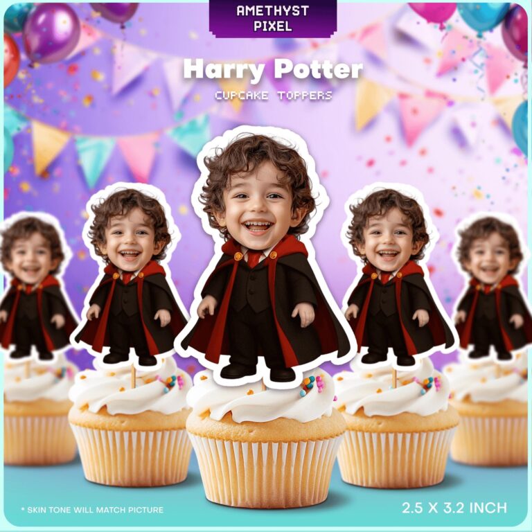 Transform your little one's special day into a magical celebration with these enchanting custom face cupcake toppers, perfectly designed for toddlers and young wizards-in-training. Featuring a charming illustration of a magical student uniformācomplete with a dapper black suit and a flowing cape accented with deep red liningāthese decorations capture the whimsy of a first-year adventure at Hogwarts. Leveraging years of experience in party styling, we ensure your childās photo is seamlessly integrated onto the character body, making them the undeniable star of the dessert table. These personalized toppers are not just for cupcakes; they add a professional, high-quality touch to muffins, donuts, or even savory party snacks. Ideal for parents seeking a unique, memorable element for a magical academy theme, these sturdy cutouts create instant visual impact and serve as delightful keepsakes for family albums.