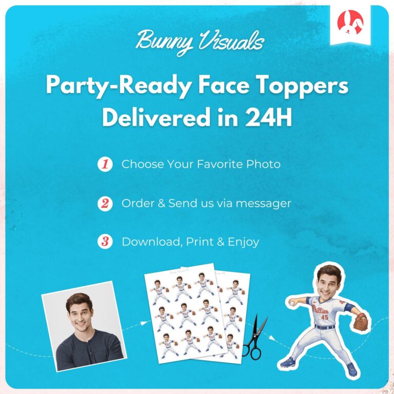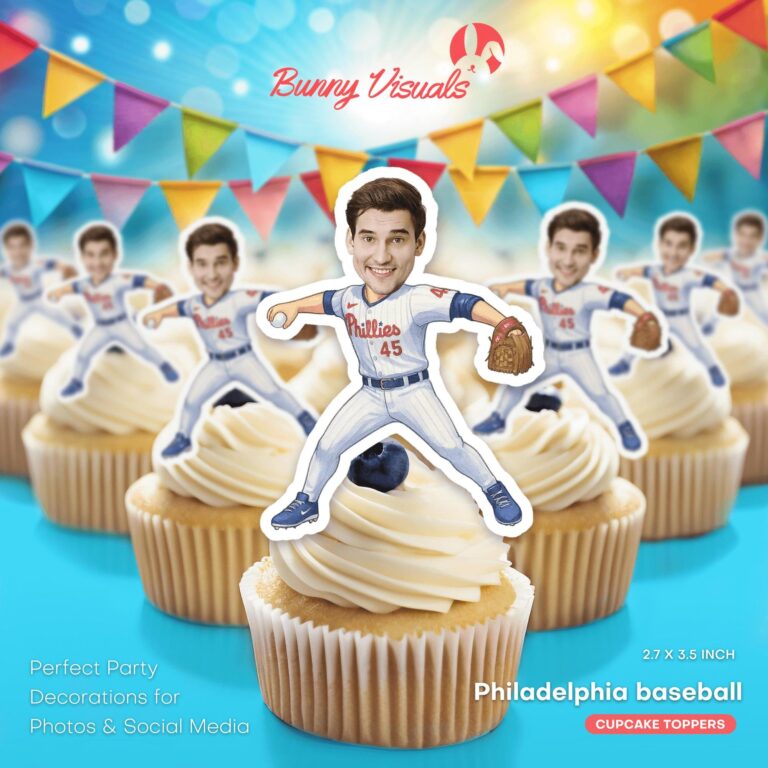 Bring the energy of Citizens Bank Park directly to your dessert table with these professionally designed Philadelphia baseball custom face cupcake toppers. Representing the ultimate fan experience, this printable decoration features a dynamic pitcher body in a classic white pinstripe uniform with iconic red script detailing, frozen in mid-throw. Specifically tailored for adult birthday celebrations, bachelor parties, or game-day gatherings, these 2.7 x 3.5-inch cutouts allow you to seamlessly feature the guest of honor as a major league legend. The high-resolution design ensures crisp printing at home, making DIY assembly simple and effective. Whether celebrating a 30th birthday or hosting a playoff viewing event, these personalized sports accents provide a humorous and memorable focal point that elevates standard cupcakes into conversation-starting centerpieces.