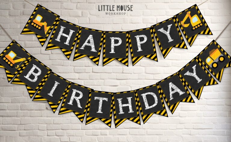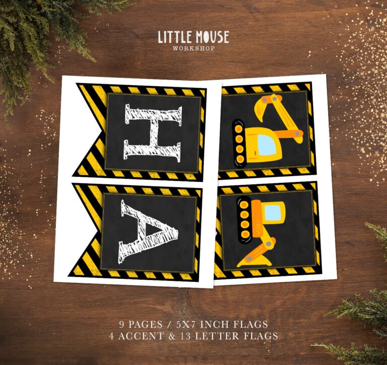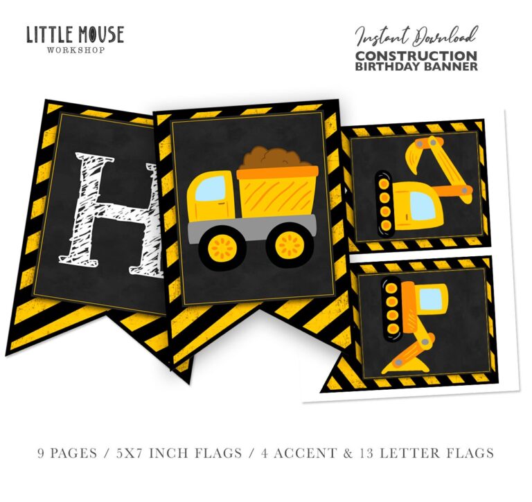Elevate the excitement at your little builder's next celebration with this rugged, high-quality Construction Birthday Banner. Designed specifically for toddlers and energetic young children who adore heavy machinery, this printable bunting features a distinctive black chalkboard background contrasted by bold yellow and black hazard stripes, mimicking authentic work zone signage. The digital file includes detailed illustrations of bright yellow dump trucks and excavators, perfectly complementing the classic sketch-style font used for the greetings. As an instant digital download providing 5x7 inch flags, this party decor offers busy parents a quick, economical way to assemble a professional-looking backdrop. Simply print on sturdy cardstock to create a durable, vibrant display that immediately establishes a fun, immersive atmosphere for a heavy equipment themed event.