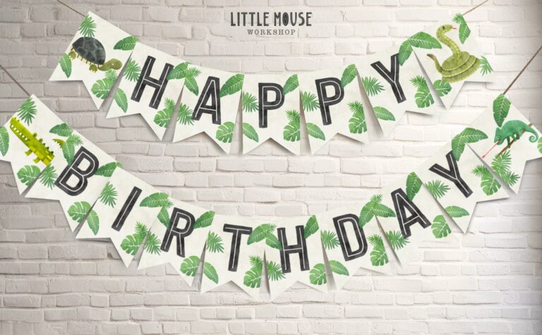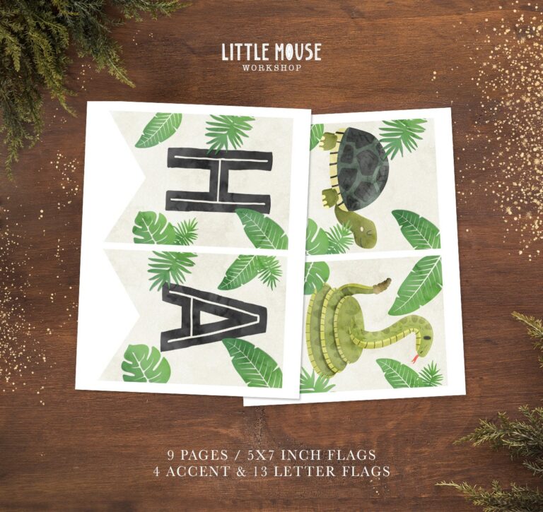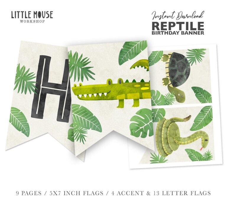 Transform your party venue into a lush, jungle habitat with this professionally designed printable reptile birthday banner. Ideally suited for young explorers and animal enthusiasts, this digital download features beautifully rendered watercolor illustrations of crocodiles, coiled snakes, and patterned turtles amidst tropical palm leaves. Each 5x7 inch flag is set on a tasteful cream textured background, ensuring the vibrant greens of the wildlife pop without overwhelming the visual aesthetic. This comprehensive kit includes spellings for "Happy Birthday" alongside four distinct animal accent flags, offering a complete, high-quality bunting that parents can easily print and assemble at home for a reliable and cohesive party look.