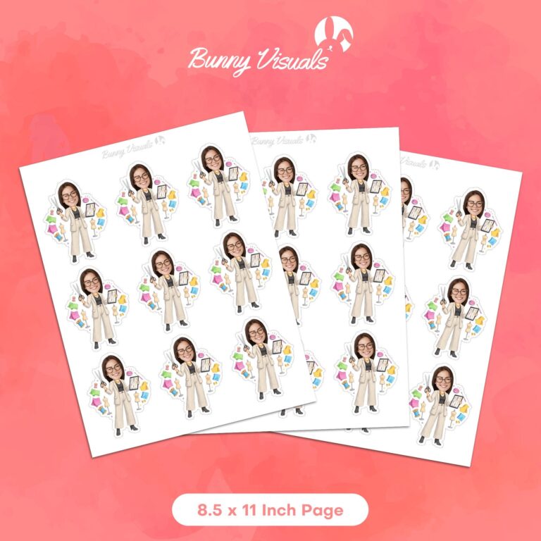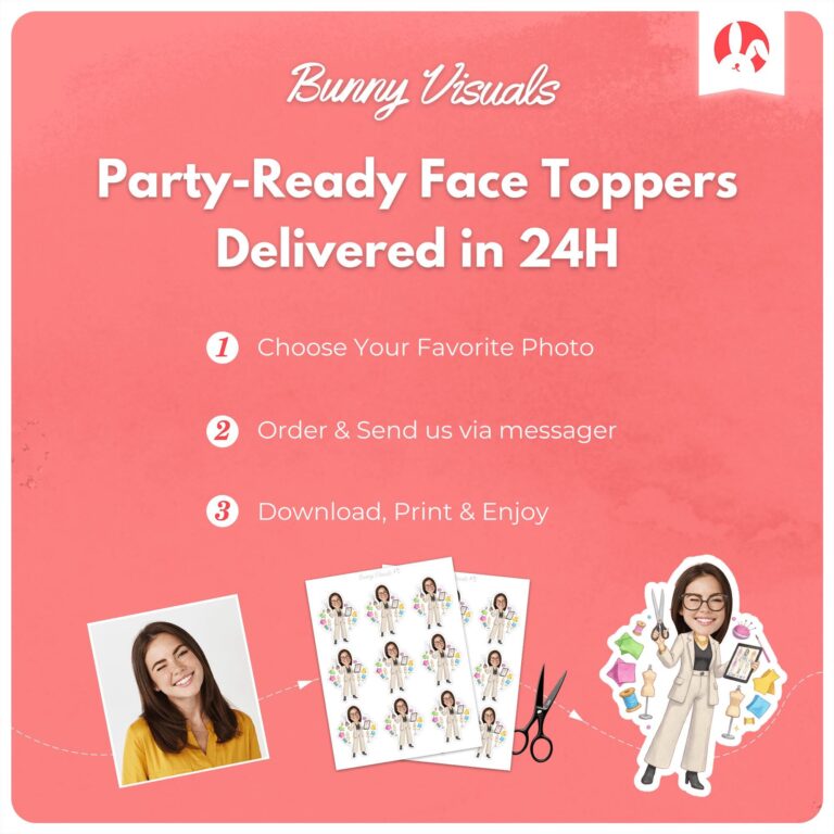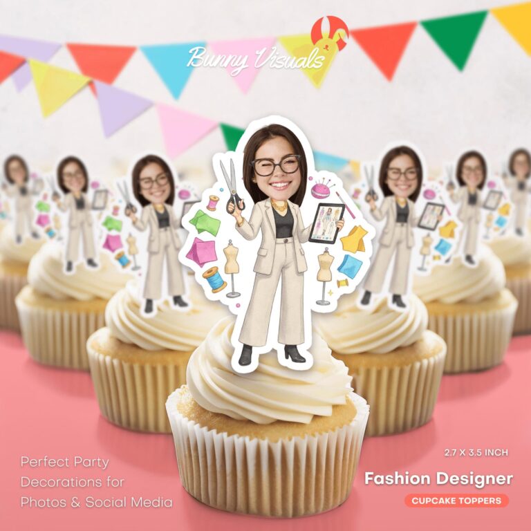 Celebrate the creative spirit of the fashionista in your life with these meticulously designed custom face cupcake toppers, specifically crafted for fashion designers, tailors, and stylists. Each topper features a personalized photo cutout of the guest of honor dressed in a chic beige pantsuit, accessorized with essential trade tools like scissors, a digital sketch pad, and floating design elements including thread spools, fabric swatches, and a dress form. Ideal for adult birthdays, fashion school graduations, or boutique launch parties, these printable decorations add a tailored touch to your dessert table. Simply upload a clear photo to create a unique tribute that highlights their passion for couture and craftsmanship, ensuring your event looks runway-ready.