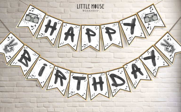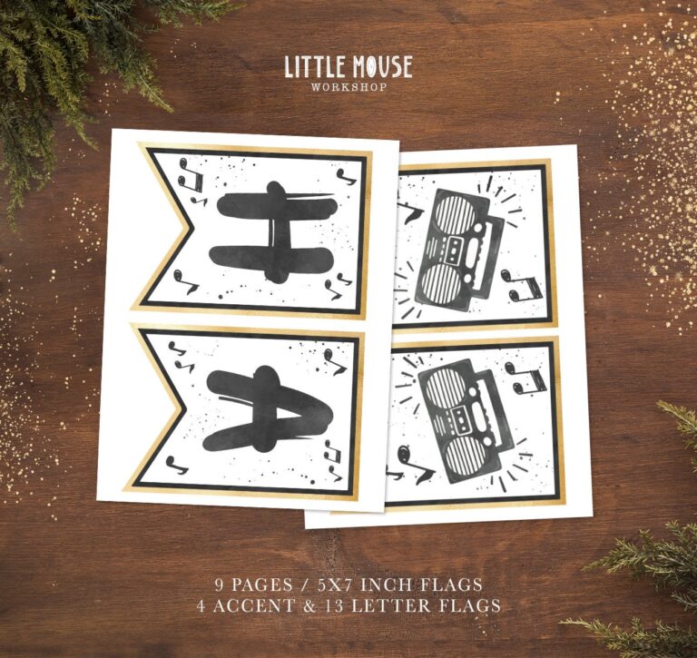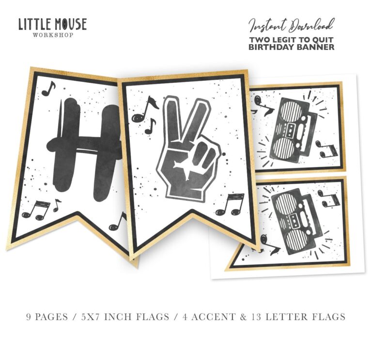 Celebrate your toddler entering their 'terrible twos' in style with this energetic Two Legit To Quit birthday banner, specifically designed for a nostalgic 90s hip-hop party theme. This high-quality digital download features professionally designed 5x7 inch swallowtail flags, each framed with a luxurious faux gold glitter border that contrasts sharply against a speckled black-and-white background. The set captures the old-school vibe with playful hand-lettered typography and iconic graphics, including retro boomboxes, peace signs, and floating music notes. Perfect for parents seeking a cool, modern aesthetic for their child's second birthday, this DIY printable ensures you can assemble a premium-looking backdrop quickly and affordably. The file includes 13 letter flags and 4 distinct accent flags, providing versatility for decorating cake tables, walls, or high chairs.