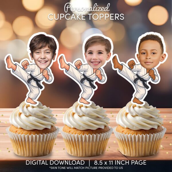 Custom Face Karate Cupcake Toppers - Personalized Martial Arts Birthday Party Decorations