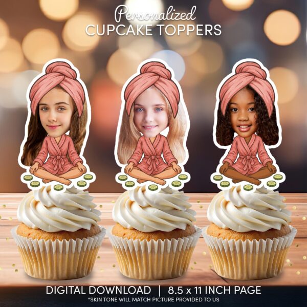 Custom Spa Party Face Cupcake Toppers – Personalized Pink Robe & Towel Printable Decor