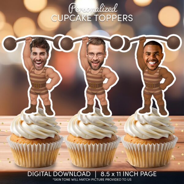 Custom Face Strongman Cupcake Toppers – Printable Vintage Circus & Gym Theme Party Décor