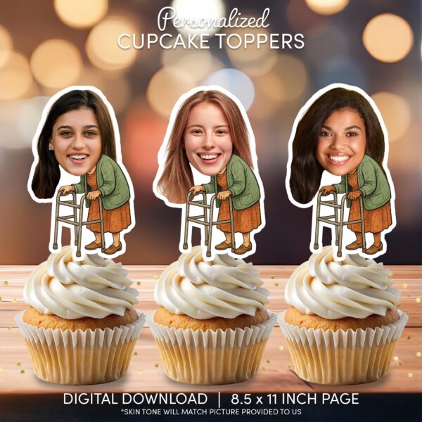 Funny Custom Face "Old Lady with Walker" Cupcake Toppers for Retirement or Milestone Birthdays