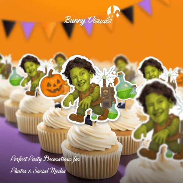 Custom Face Frankenstein Monster Cupcake Toppers with Spooky Lab Props