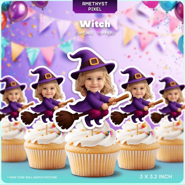 Personalized Flying Witch on Broomstick Photo Cupcake Toppers for Kids