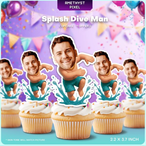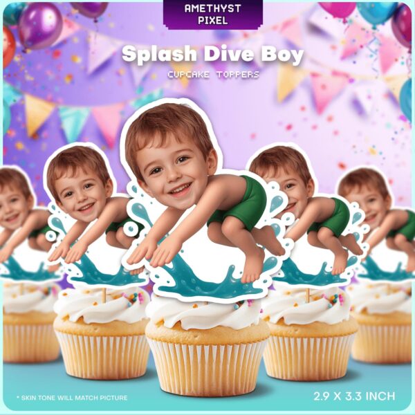 Custom Face Splash Dive Boy Cupcake Toppers for Swimming Pool Parties