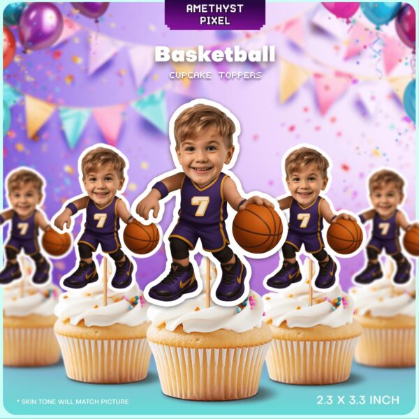 Personalized Basketball Player Cupcake Toppers Featuring Custom Face Photo in Purple Uniform