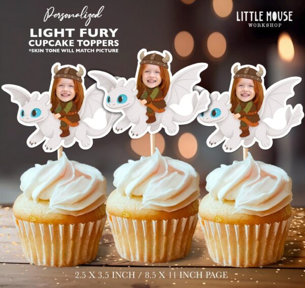 Custom Photo Light Fury Viking Cupcake Toppers – Personalized Dragon Rider Party Décor