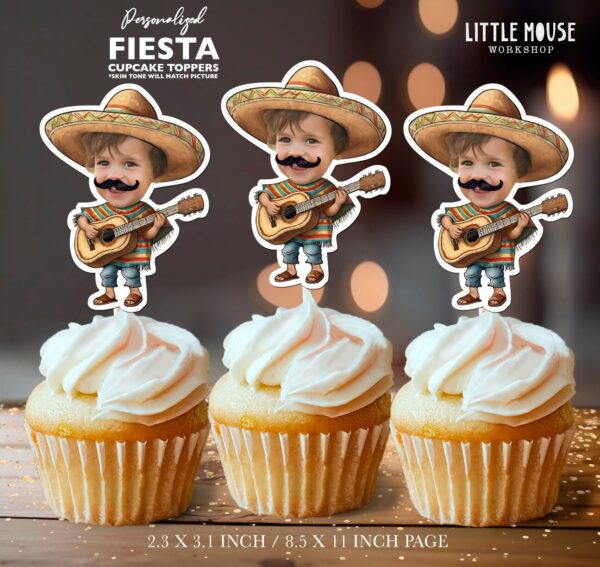 Custom Face Mariachi Boy Cupcake Toppers – Personalized Fiesta Birthday Decoration