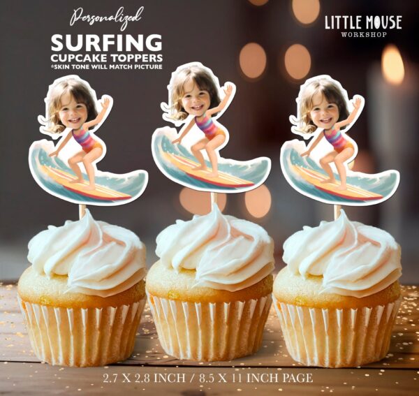 Custom Photo Surfing Cupcake Toppers for Girl Beach Birthdays - Printable Surf Decor