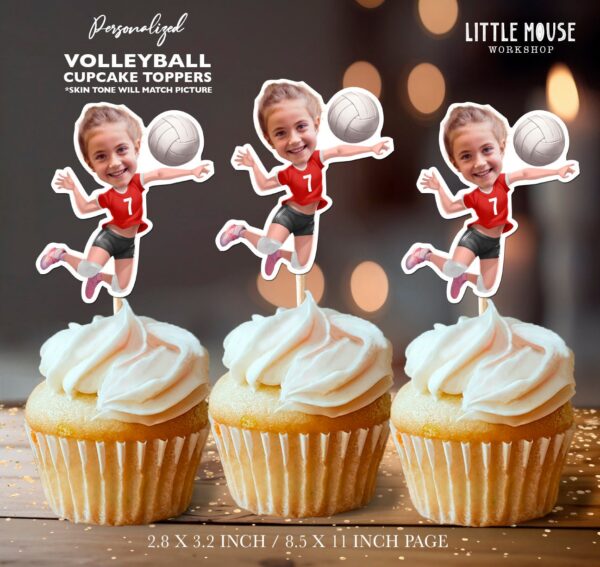 Custom Face Volleyball Girl Cupcake Toppers - Personalized Red Jersey Sports Party Décor