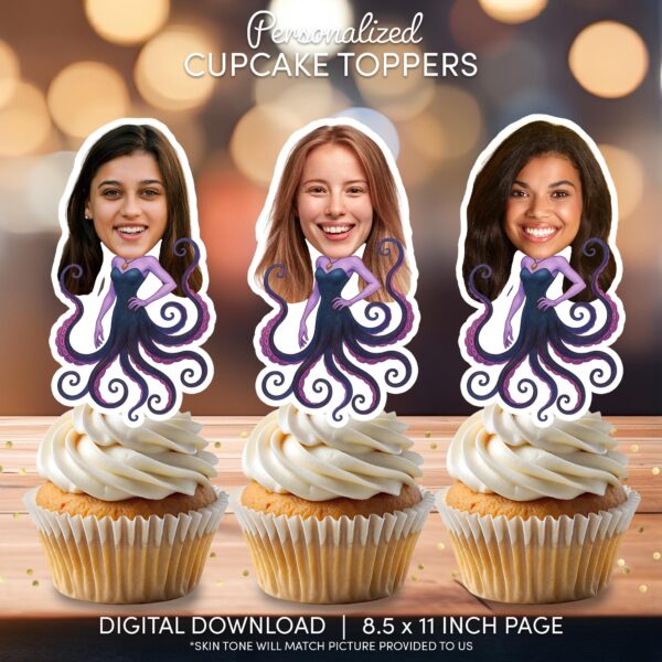 Custom Sea Witch Cupcake Toppers – Personalized Face on Body Ocean Villain Party Decoration