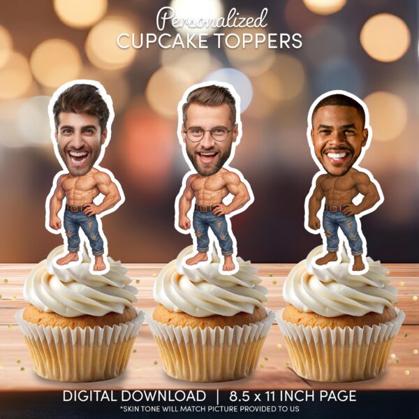 Custom Face Muscle Man Cupcake Toppers – Printable Hunk Bachelorette Party Decor
