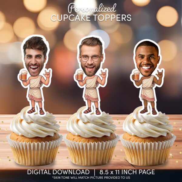 Custom Face Toga Party Cupcake Toppers – Printable Greek God with Beer Decorations