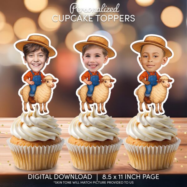 Funny Farmer Riding Sheep Custom Face Cupcake Toppers - Printable Barnyard Birthday Decor