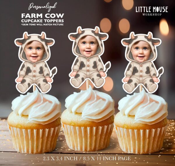 Personalized Custom Photo Farm Cow Cupcake Toppers – Barnyard Theme Decor