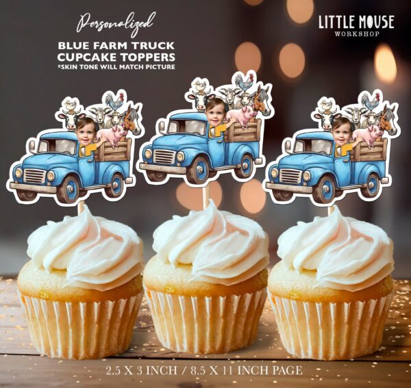 Personalized Face Blue Farm Truck & Animals Cupcake Toppers