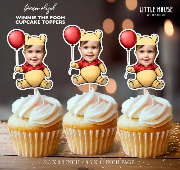 Personalized Classic Pooh Cupcake Toppers with Custom Baby Face and Red Balloon for First Birthdays