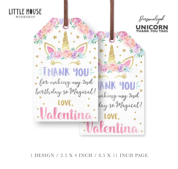 Personalized Magical Floral Unicorn Thank You Tags with Watercolor Blooms and Gold Glitter Effects for Birthday Favors