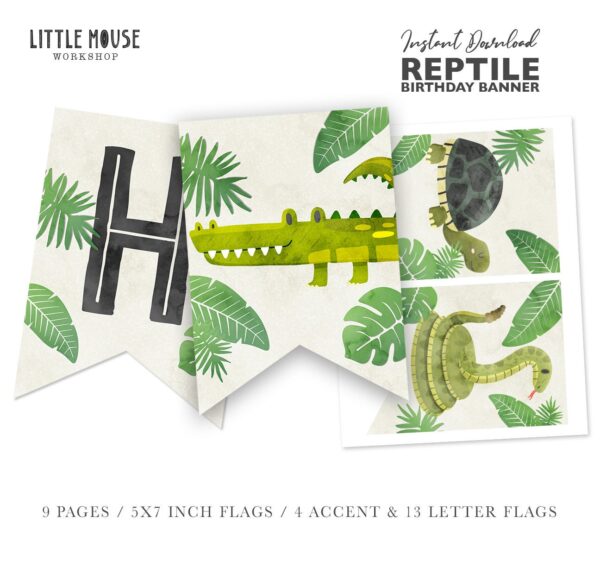 Printable Watercolor Reptile Birthday Banner featuring Alligator, Snake, and Turtle Flags