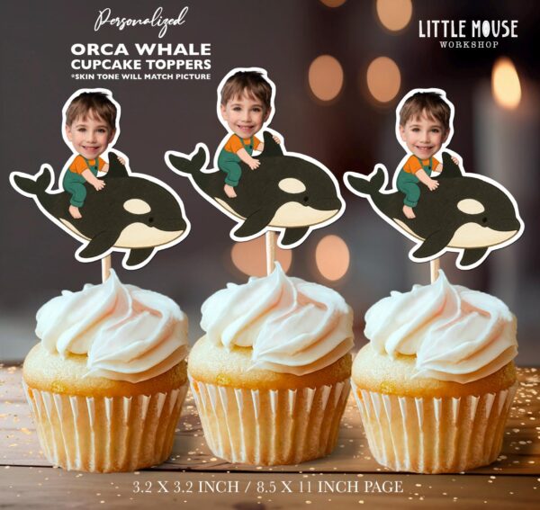 Personalized Face on Orca Whale Cupcake Toppers for Ocean Theme Birthdays
