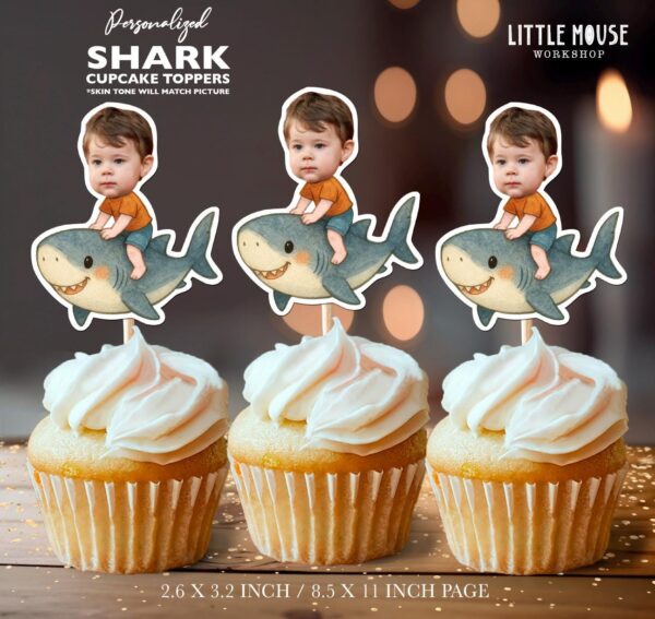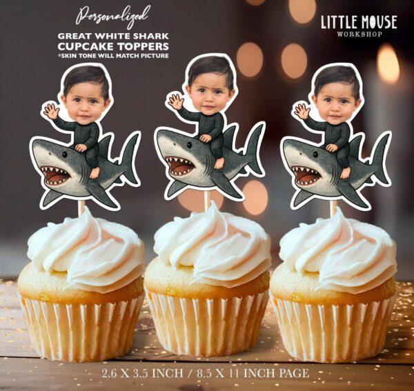 Personalized Shark Rider Cupcake Toppers with Custom Face for Ocean Birthday Parties