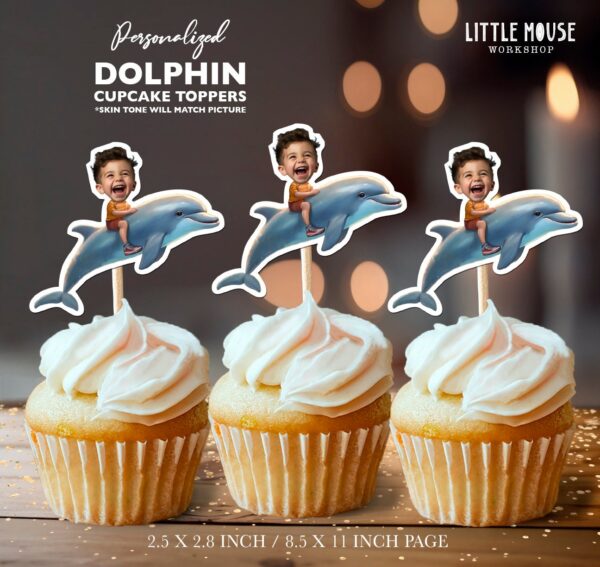 Personalized Face Dolphin Rider Cupcake Toppers – Custom Photo Ocean Theme Party Decor