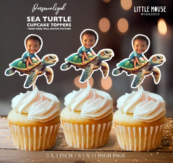 Custom Face Sea Turtle Riding Photo Cupcake Toppers