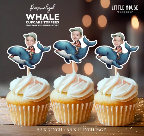 Custom Face Blue Whale Riding Cupcake Toppers – Nautical Boy Theme