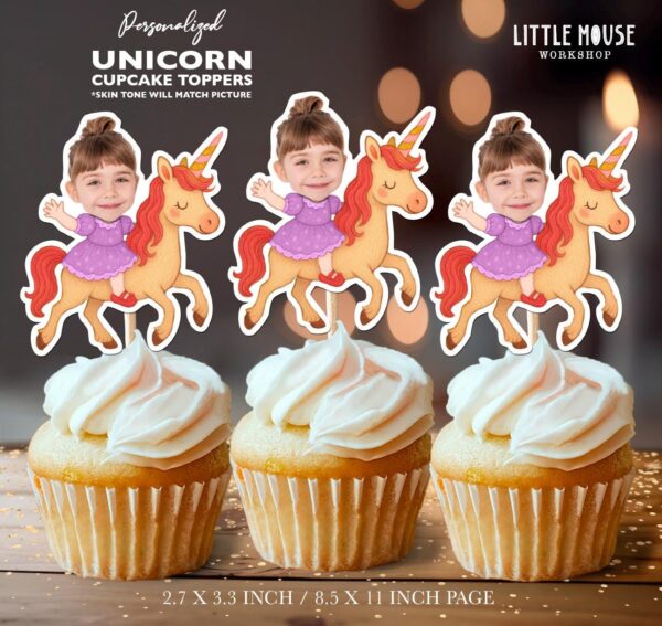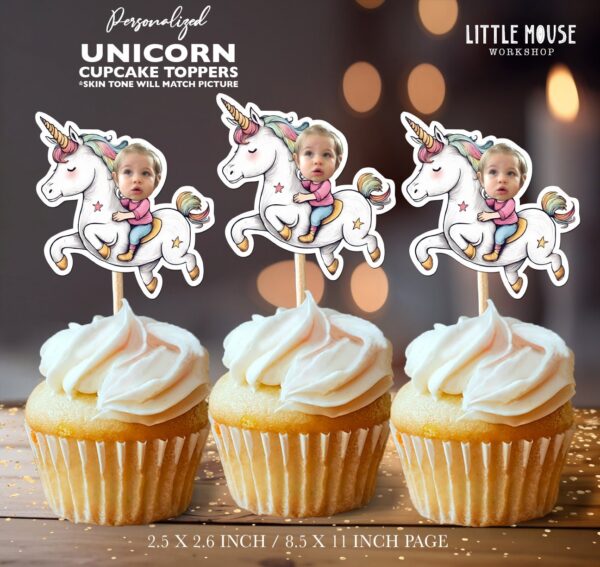 Personalized Face Riding Unicorn Cupcake Toppers for Magical Girl Birthdays