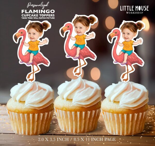 Custom Face Flamingo Riding Cupcake Toppers for Tropical Birthday Parties