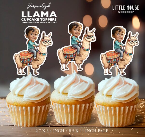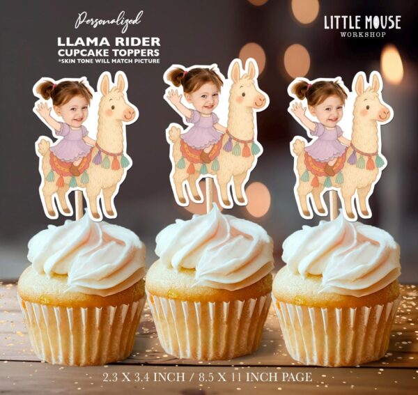 Custom Face Llama Cupcake Toppers – Personalized Alpaca Riding Photo Decoration for Toddler Fiestas