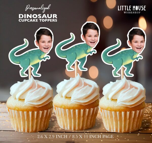 Custom Face Dinosaur Cupcake Toppers – Personalized Green T-Rex Photo Decoration for Boys Birthday