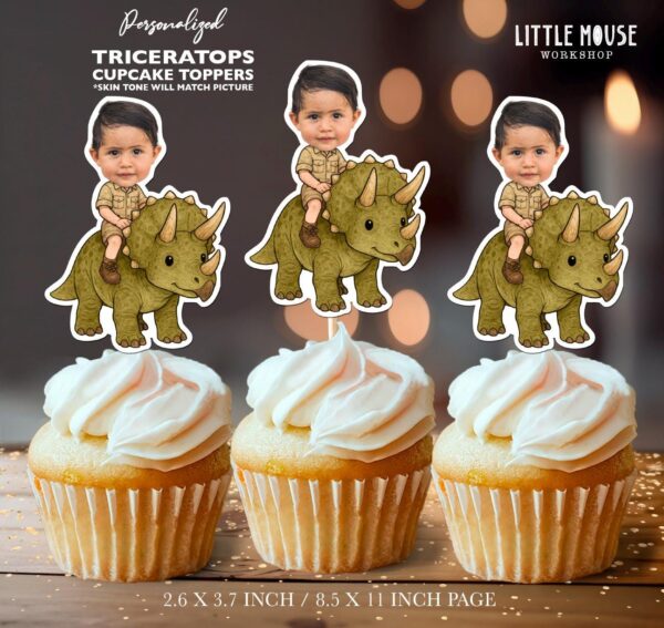 Custom Face Triceratops Dinosaur Cupcake Toppers for Birthday Parties