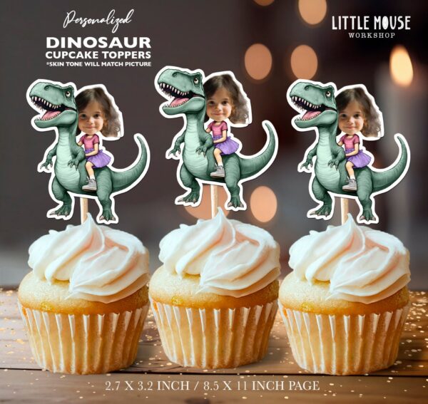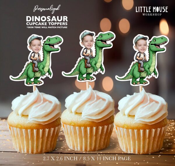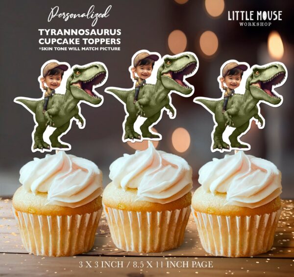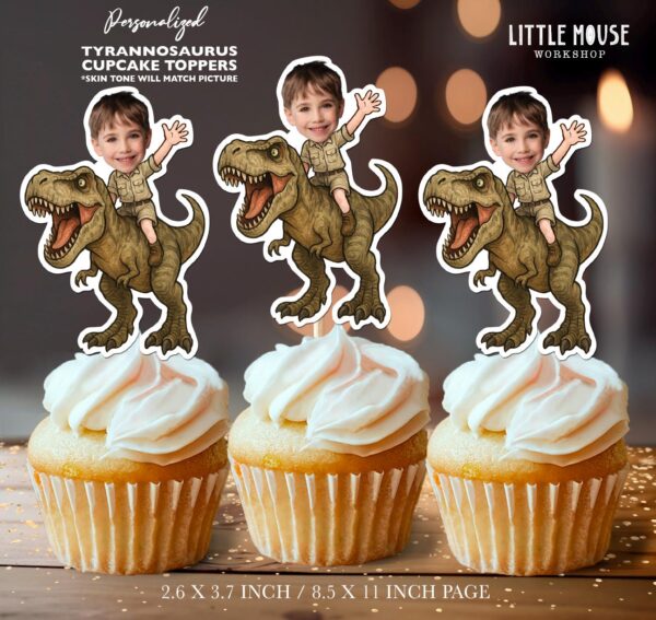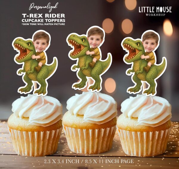 Personalized T-Rex Rider Cupcake Toppers – Custom Face Dinosaur Birthday Party Decoration
