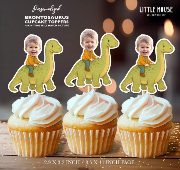 Custom Face Riding Brontosaurus Cupcake Toppers for Personalized Dinosaur Birthday Parties