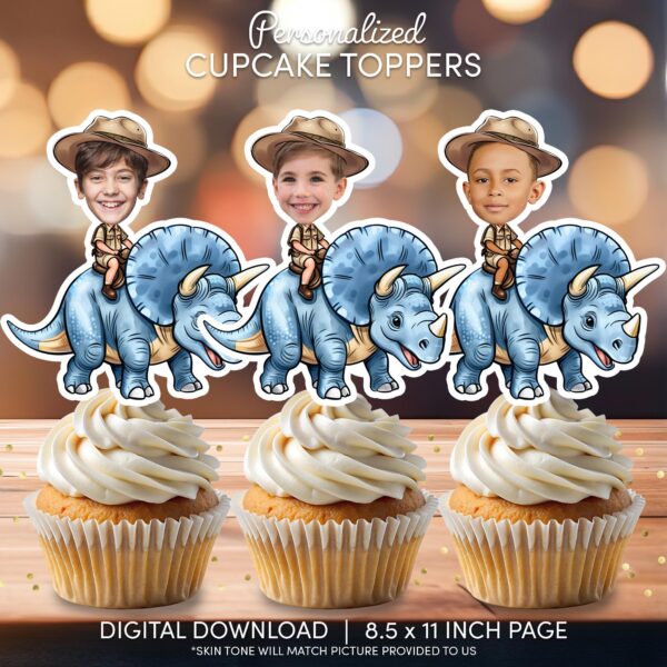 Custom Face Dinosaur Rider Cupcake Toppers – Personalized Safari Triceratops Party Decoration