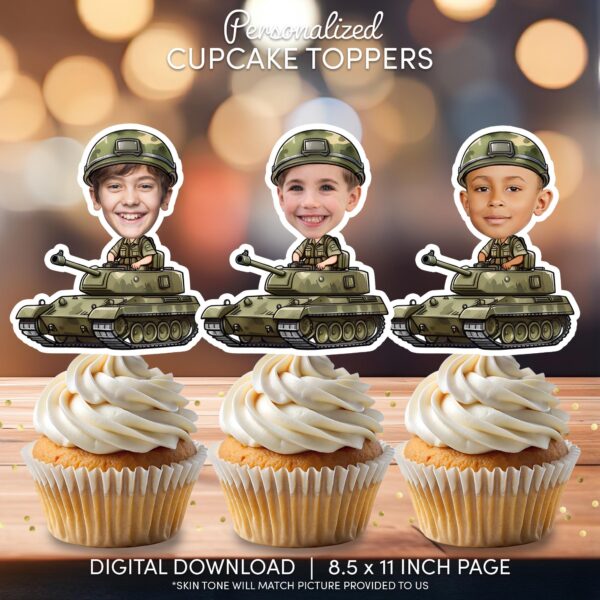 Custom Photo Army Tank Cupcake Toppers - Printable Military Birthday Decorations
