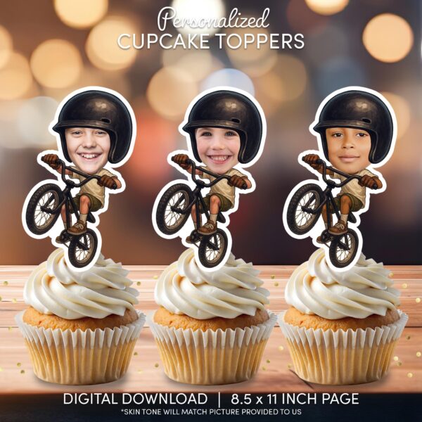 Custom BMX Biker Face Cupcake Toppers - Personalized Cycling Party Decoration