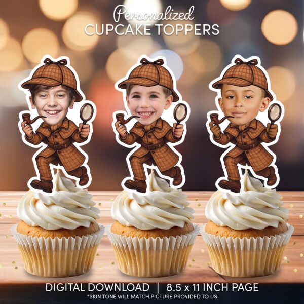 Personalized Detective Cupcake Toppers Custom Face Photo Printable Mystery Party Decor