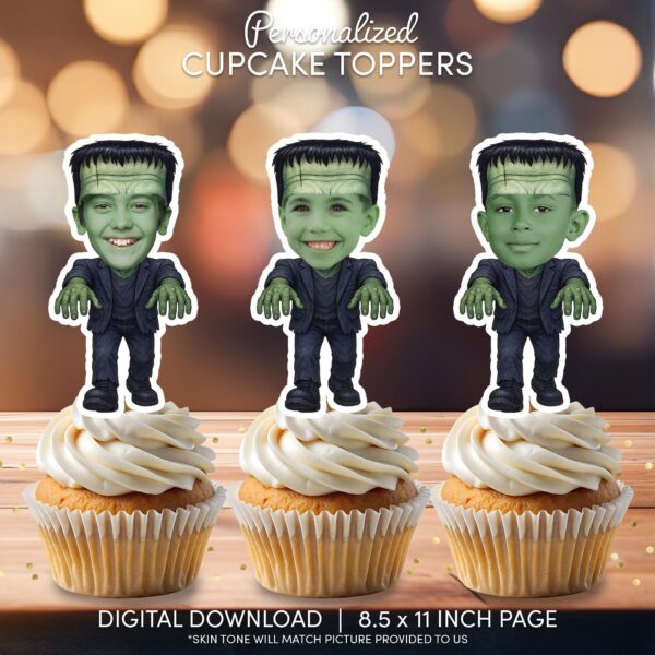 Custom Frankenstein Face Cupcake Toppers – Printable Green Monster Halloween & Birthday Decor