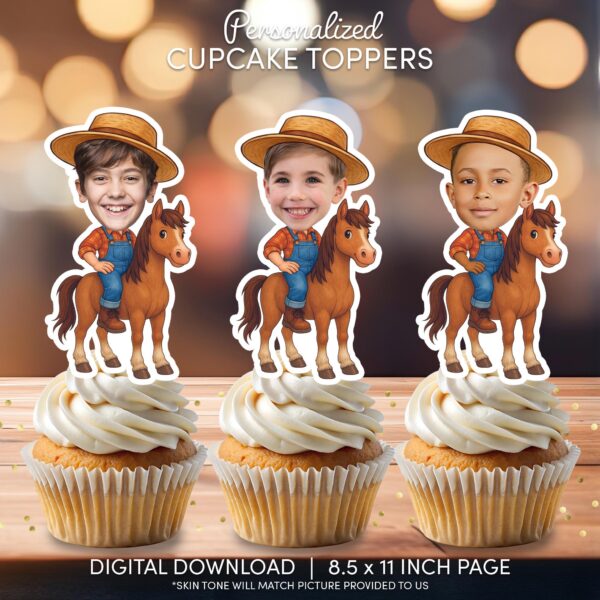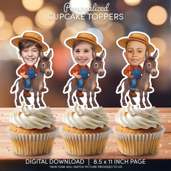Personalized Donkey Rider Cupcake Toppers – Custom Face Farm Birthday Printable Decoration