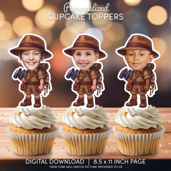 Custom Face Explorer Cupcake Toppers – Printable Jungle Safari & Adventure Birthday Party Decorations