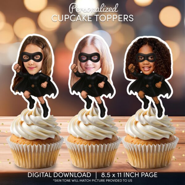 Custom Face Superhero Girl Cupcake Toppers - Black Suit & Mask Printable Party Decor