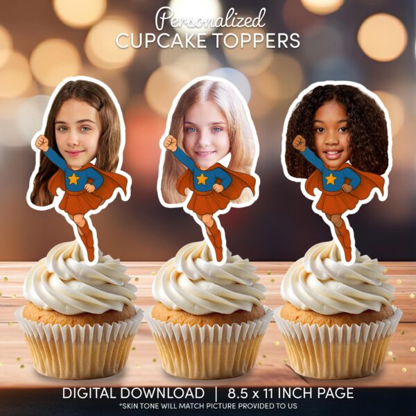 Custom Superhero Girl Face Cupcake Toppers - Printable Flying Hero Birthday Decoration