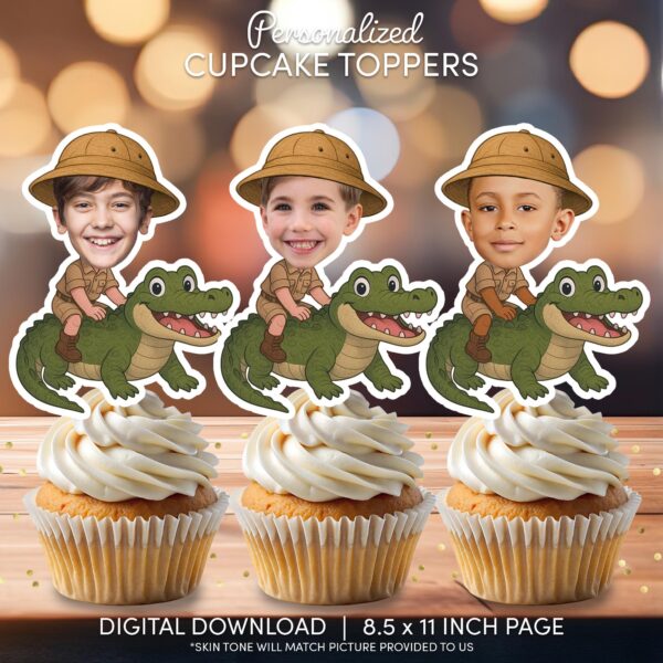 Custom Face Alligator Rider Cupcake Toppers - Printable Safari Explorer Birthday Party Decor