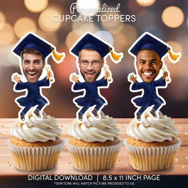Custom Face Graduation Cupcake Toppers - Celebrating Navy Blue Cap and Gown Printable